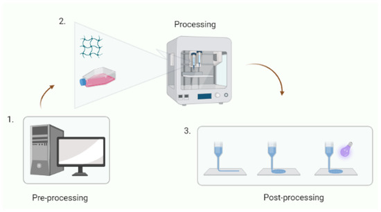 Bioprinting involves three steps: preprocessing, processing, and post-processing [36,37]. In preprocessing, a design is created by fusing the desired model with computer-aided design (CAD). Alternatively, the design can also be generated with a blueprint of tissues and organs using image techniques, such as computed tomography (CT) or magnetic resonance imaging (MRI) [38]. The printing and post-printing are equivalent to the simultaneous deposition of cells and biomaterials using deposition techniques [34,39].