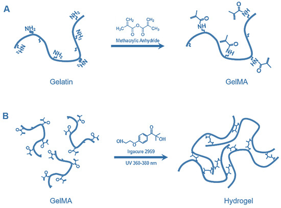 GelMA is derived from gelatin (porcine or fish) and presents essential characteristics, such as lower immunogenicity, compared to its precursor (denatured collagen) [70]. Arginine-glycine-aspartic acid (RGD) is the bioactive part of gelatin, which stimulates the adhesion and growth of cells, and a metalloproteinase (MMP) matrix can be used for cell remodeling. Gelatin modification is obtained when the gelatin reacts with methacrylic anhydride and is optically cross-linked in the presence of photo-initiators [70,71]. Figure 6 shows the synthesis of GelMA hydrogels.