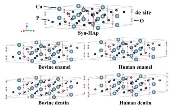 Table 2 summarizes the occupancies and atomic coordinates. A lower occupancy of the Ca1 was revealed for dentin than enamel, but there was no remarkable difference within species. There are differences in the occupancies of the P site between dentin and enamel, which shows lower occupancies of the P in dentin than in enamel for both species. When compared between bovine and human dentin, it is noteworthy that the occupancy of P is lower for the former. Meanwhile, for enamel, the occupancies Ca1 and P are greater for bovine enamel than human enamel. The atomic coordinate of O4 site, i.e., O(H), is 0.072, 0.102, 0.167, and 0176 for bovine dentin, human dentin, bovine enamel, and human enamel, respectively. Since the site of the O4 of stoichiometric hydroxyapatite is 0.18819 (Table S1), this indicates that the hydroxyl in dentin for both species, especially for bovine dentin, is located proximately to the (0,0,0) site compared to that of stoichiometric hydroxyapatite. The displacement of O4 site is visualized by the VESTA system in Figure 2.
