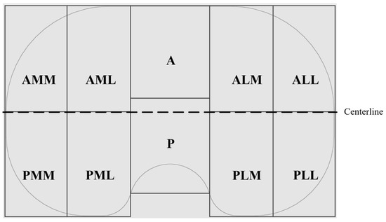 Schematic of the proximal surface of a right insert with partitioning in anterior (A) and posterior (P) portions, as well as medial (M) and lateral (L) compartments on each side.