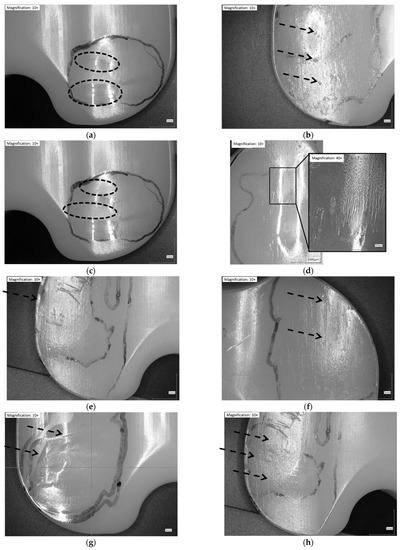 The striated wear pattern established by Wimmer et al. [9] could be identified on the inserts from standard wear test in agreement with Harman et al. [21] and under malpositioning conditions. However, the striated wear patterns were less distinct on the inserts from the TBW test and the retrievals. This might be due to the differences in the analyzed knee endoprostheses, i.e., implant material and design. Rim-runners as found by Wasielewski et al. [25] (specified as cold-flow) and Fabry et al. [24] (specified as creeping at the edge region) are supposed to be a sign of malrotation, or general malalignment and mismatch of the chosen component sizes. In the wear simulation, rim-runners were associated with implant malpositioning (internal rotation of the femoral component and increased tibial slope). On all of the retrieved inserts that were examined, rim-runner was found. The presence of wear patterns in the retrievals examined beyond the actual bearing surfaces may be associated with flat insert design, a false combination of sizes, or for a specific event (trip, stumble, crash, etc.). Rim-runners can occur in case of higher ranges of motion and possible malpositioning of the implants, as the ”height of the insert” parameter revealed medium correlation with the occurrence of rim-runners. In addition to malpositioning, a difficult ligament situation was possible owing to the occurrence of rim-runners and higher inserts. This was confirmed by the correlation between the height of the inserts and the total wear area on the lateral compartments of the inserts. However, the data presented here revealed no correlation between wear patterns and areas and the implant size. The use of optical microscopy at low magnifications and simple grading systems [21,27] may improve retrieved inserts’ evaluation.