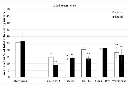 Distribution of percentual total wear areas. Significances, marked with asterisks (one asterisk *: p < 0.05 and two asterisks **: p < 0.01), are shown to facilitate the comparison of retrievals with simulator-tested groups.