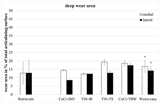 The retrievals’ deep wear areas (Figure 4) were significantly smaller than in the entire group of worst-case inserts (medial: p = 0.045, lateral: p = 0.028, entire: p = 0.022).