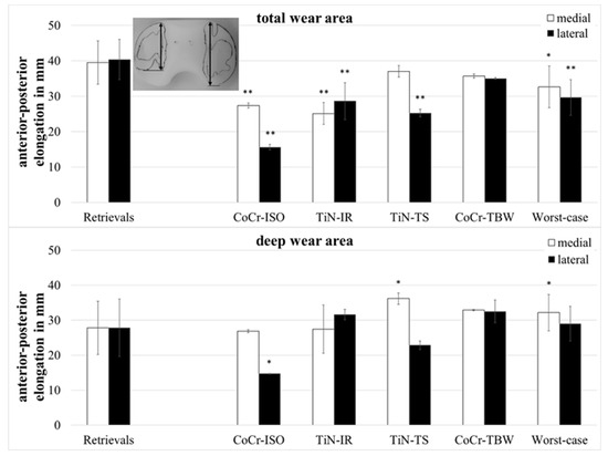 The anterior–posterior (ap-) elongation of the total wear areas (Figure 5) showed significantly larger values for the retrievals on both compartments when compared with the CoCr-ISO set (medial: p = 0.002, lateral: p = 0.001), the TiN-IR set (medial: p = 0.002, lateral: p = 0.007), and the worst-case simulation (medial: p = 0.028, lateral: p < 0.001) and on the lateral compartment compared with the TiN-TS set (p = 0.001).