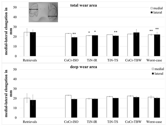Dimensions of medial–lateral elongation of wear areas of retrieved and simulator-tested UHMW-PE inserts. Significances, marked with asterisks (one asterisk *: p < 0.05 and two asterisks **: p < 0.01), are shown to facilitate the comparison of retrievals with the simulator-tested groups.