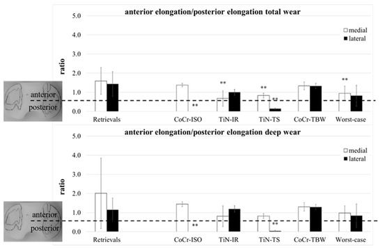 The ratio of anterior part of ap-elongation and posterior part of ap-elongation of retrieved and simulator-tested UHMW-PE inserts for total and deep wear areas. Significances, marked with asterisks (two asterisks **: p < 0.01), are shown to facilitate the comparison of retrievals with the simulator-tested groups.