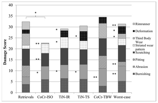 Distribution of each wear pattern on the damage score for retrieved and simulator-tested inserts. Significances, marked with asterisks (one asterisk *: p < 0.05 and two asterisks **: p < 0.01), are shown to facilitate the comparison of retrievals with the simulator-tested groups. (Maximum score for each wear pattern was 8, Maximum total damage score was 64).