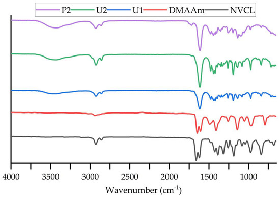 FTIR spectra of NVCL, DMAAm, U1, U2 and P2 samples. n = 2.