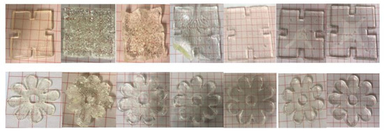 The model of a jigsaw and flower shape were designed in Solidworks software; the size and patterns are shown in Figure 1. The thickness of the models is 2 mm. In order to prepare the silicone mould for photopolymerisation, the jigsaw and flower prototypes were printed using the SLA Form 2 3D printer with V2 High Temperature resin (Formlab company, Berlin, Germany). The prototype made of High Temperature resin has tough properties to avoid adhesion during the mould processing.