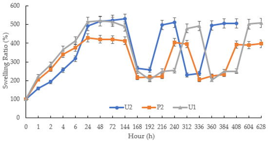 The pulsatile swelling behaviours of photocured and printed chemically crosslinked P(70NVCL/30DMAAm) copolymer hydrogels. n = 3.
