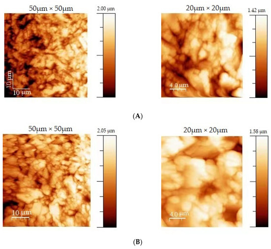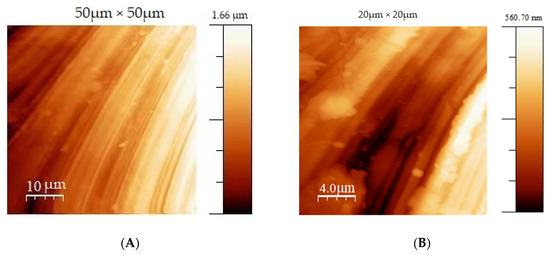 False color images resulting from the AFM analysis of the machined titanium discs for two different areas: (A) magnification 50 µm × 50 µm, (B) magnification 20 µm × 20 µm. Color intensities correspond to the distances in the z-direction, as shown in the respective scale bars.