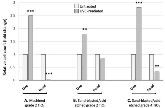 Attachment/proliferation MC3T3 after 24 h (A) results for the titanium grade 2 machined surface (B) results for the grade 2 sand-blasted/acid-etched titanium (C) results for the grade 4 sand-blasted/acid-etched titanium. Results shown are the means of two separate determinations. For the statistical analysis of the cell count obtained for the UVC-treated discs, it was compared to the non-treated ones, used as the control. ** p ˂ 0.01; *** p ˂ 0.001.