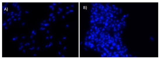 Fluorescence of MC3T3 cells nuclei stained with Hoechst dye, 24 h after seeding on a grade 4 sand-blasted/acid-etched titanium surface. Two distinct microscopic fields are shown (A,B); magnification: ×25.