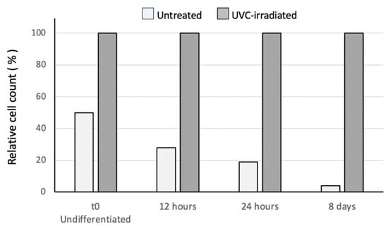 As in the experiments previously described on the pre-osteoblastic cell line, we first compared the percentage of the viable cells in the sand-blasted/acid-etched grade 4 titanium discs, before and after the UV-photofunctionalization. Figure 5 shows that, consistently with the data obtained using the MC3T3 cells, 24 h after seeding, the number of viable primary MSCs counted on the non-irradiated discs was half the number of cells grown onto the UV-photofunctionalized disks. Moreover, following the osteogenic induction, we observed a progressive and dramatic decrease of living cells in non-irradiated discs, as compared to UVC-treated disks. At 8 days of osteogenic differentiation, the cells present on the untreated disks were only a very small percentage (around 4%) of the cells grown on the irradiated surfaces.