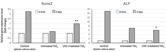 RT-PCR of the transcription factor Runx2 and enzyme alkaline phosphatase (ALP) in undifferentiated MSC cells and at 3 days after the proliferation/differentiation on the untreated vs. UVC-irradiated sand-blasted/acid-etched grade 4 titanium discs. Results shown are means of two separate determinations. For the statistical analysis, the RT-PCR results obtained for the photofunctionalized discs was compared to the non-treated and with no disc used as the control. * p ˂ 0.05; ** p ˂ 0.01.