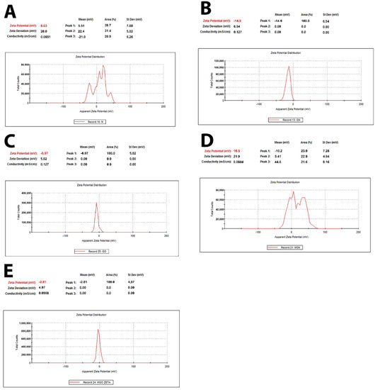 Zeta potential of MEL, GN, GO, and complexes. (A)—MEL; (B)—GN; (C)—GO; (D)—MGN; (E)—MGO.
