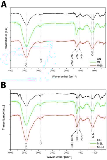 FT-IR spectra. (A)—GN, MEL, MGN; (B)—GO, MEL, MGO.