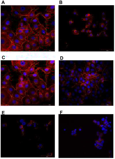 Immunofluorescence images of MCF-7 line cells stained for actin filaments (red) and nuclei (blue). (A)—control, (B)—MEL-treated group, (C)—GN-treated group, (D)—GO-treated group, (E)—MGN-treated group, and (F)—MGO-treated group.