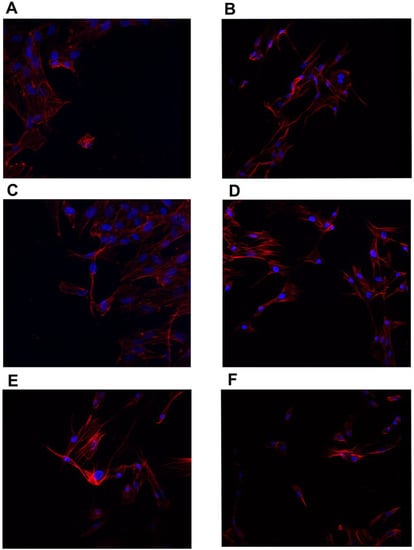 Immunofluorescence images of HFFF2 line cells stained for actin filaments (red) and nuclei (blue). (A)—control, (B)—MEL-treated group, (C)—GN-treated group, (D)—GO-treated group, (E)—MGN-treated group, and (F)—MGO-treated group.