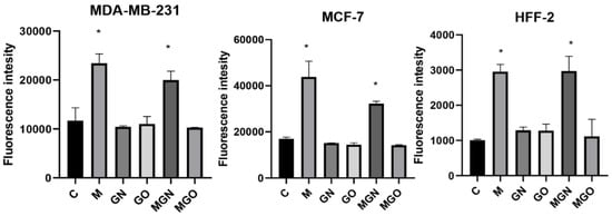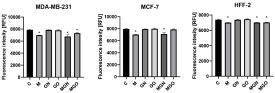 The results of the cell membrane potential analysis are shown in Figure 7. After 4 h, significant differences were obtained in the potential of cell membranes for all lines in individual research groups: for the MDA-MB-231 line in M, MGN, and MGO groups (respectively, decrease: 882, 1106, 551 relative fluorescence units (RFUs)); for the MCF-line in the M group and MGN (respectively, decrease: 929, 847 RFUs); and for the HFFF2 line in the M, MGN, and MGO groups (respectively, decrease: 384, 370, 356 RFUs).