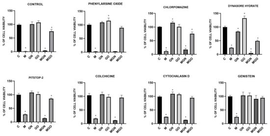 Effect of transport inhibitors on the internalization of M, GN, GO, MGN, and MGO into HFFF2 cells. C signifies the control samples and the results are mean values ± standard deviation. “*” indicates statistically significant differences in comparison to the control (p-value ≤ 0.05).