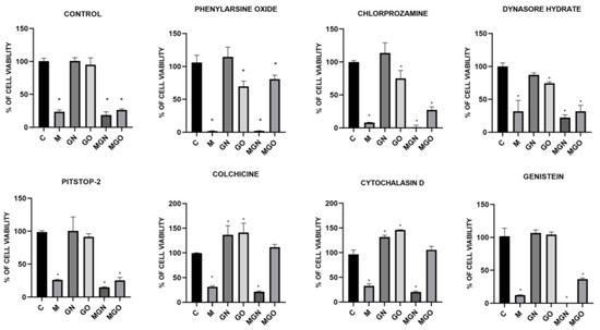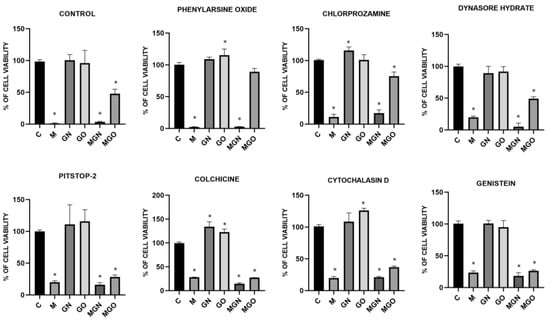It is evident that MEL degrades cells by creating pores in the membrane, while carbon nanoparticles are taken into cells by internalization [40]. In the conducted study, it was checked whether the MEL complexes with GN and GO are also taken up by cells, just like the nanoparticles themselves. For this purpose, a viability test was performed using the following cellular transport blockers: Pitstop-2, colchicine, cytochalasin D, genistein, phenylorsine oxide, chlorpromazine, and dynasore hydrate.