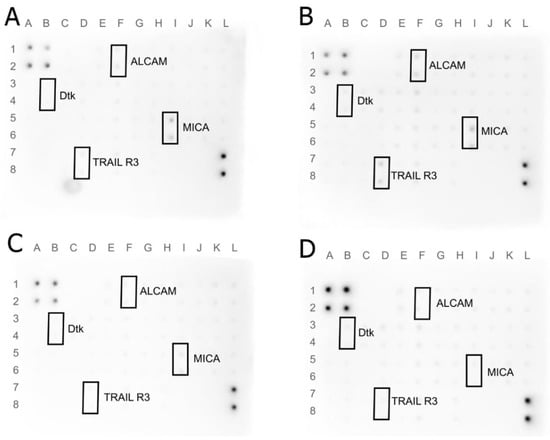 Antibody array analysis of human cell membrane receptor (original drafts) in MDA-MB-231 cells. (A)—control group, (B)—MEL-treated group, (C)—MGN-treated group, and (D)—MGO-treated group. Results were normalized and compared to a dots control sample.