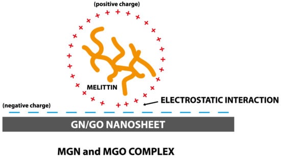 The DLS results of the MGO sample showed that the use of MEL affects the stabilization of GO particles in the colloids and prevents their aggregation. Further, the average DLS values are higher for the MGN and GO complexes than the nanoparticles themselves, which may indicate the formation of complexes of the nanoparticles with MEL. Since the FTIR spectra do not show new or more intense bands, it can be concluded that MEL and carbon nanoparticles are connected by a physical bond (Figure 13). The results of the Zeta potential showed the opposite charge of the components, which confirms the electrostatic interaction occurring in the complexes [62].