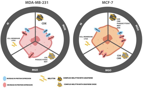 To summarize, the MDA-MB-231 and MCF-7 lines, which differ in the presence of estrogen receptors on the cell surface, react differently to the studied MEL complexes and carbon nanoparticles (Figure 14). The differences were shown by the analysis of the expression of membrane receptor proteins and the potential of the cell membrane. In turn, the MGN complex showed a greater reduction in viability than the MEL itself, which may be related to the high entrapment of MEL with GN and its reduced interaction with the outer membrane and increased interaction with intracellular structures. The use of nanoparticles as carriers did not reduce the toxicity to healthy cells, but these were in vitro studies, where one cell line was grown in one bottle, so in vivo studies should be carried out, where healthy and neoplastic cells are in contact with each other.