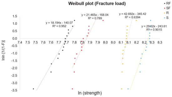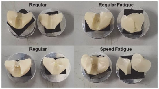 - Pereira, G.K.R.; Guilardi, L.F.; Dapieve, K.S.; Kleverlaan, C.J.; Rippe, M.P.; Valandro, L.F. Mechanical reliability, fatigue strength and survival analysis of new polycrystalline translucent zirconia ceramics for monolithic restorations. J. Mech. Behav. Biomed. Mater. 2018, 85, 57–65. [Google Scholar] [CrossRef]