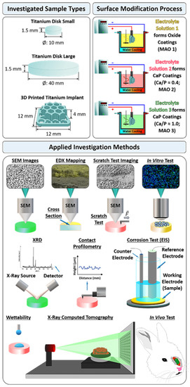 The bone fragments were decalcified in 8.5% formic acid solution (purity for analysis, purchased from CJSC “Vekton”, St. Petersburg, Russia). After that, the tissue samples were dehydrated and impregnated with paraffin in a Leica ASP-300S tissue processor (Leica Biosystems Nussloch GmbH, Nussloch, Germany). Further, the material was mounted on cassettes. The slices with a thickness of about 5–7 µm were prepared on a Leica RM 2255 rotary microtome (Leica Biosystems Nussloch GmbH, Nussloch, Germany), mounted on glass slides and stained with a solution of hematoxylin and eosin (purchased from JSC “LenReaktiv”, St. Petersburg, Russia) in a Thermo Gemini AS histology slide stainer (Thermo Fisher Scientific Inc, Waltham, MA, USA). Subsequently, the microscopic examination was carried out using a light microscope (Axio Scope A1, Carl Zeiss Microscopy Deutschland GmbH, Oberkochen, Germany). The study includes an analysis of the contact between the implant material and bone tissue, assessment of the intensity of inflammatory process and composition of the inflammatory infiltrate, assessment of the intensity of the fibroblast reaction, and the presence and degree of osteogenesis. A summary of the used sample types, surface modification process via MAO, the applied measurement principles and setups for investigations is graphically displayed in Figure 1.