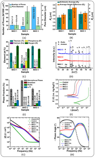 Physical and chemical properties of titanium samples coated by three different MAO coatings. (A) Average number of pores per surface area and average pore diameters; (B) surface roughness, which is shown by arithmetic average (Ra) and average height difference (Rz); (C) elemental composition determined by EDX; (D) X-ray diffraction pattern; (E) crystallite phase fraction composition calculated by peak fittings of the XRD pattern shown in (D); (F) potentiodynamic polarization curves recorded in 0.9% NaCl solution; (G) evolution of impedance modulus versus frequency; (H) evolution of phase angle versus frequency for the MAO 1–3 coatings.
