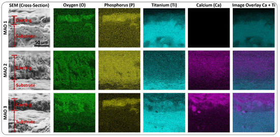Investigation of the elemental composition of the MAO 1–3 coatings via cross-section SEM micrographs and EDX mapping. Each MAO coating reveals a significantly different layered structure. The scale bar is 50 µm and representative for all micrographs shown in this figure.
