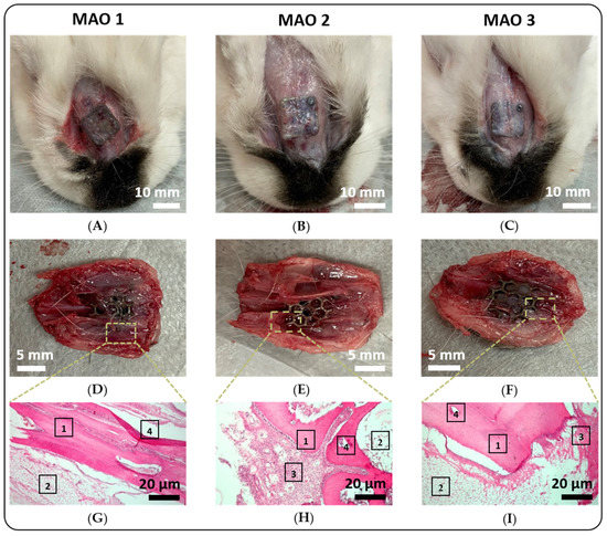 Histological evaluation: Analysis of bone tissue fragments with adjacent soft tissues from the area of implantation shows fibrosis of varying degrees observed for all 3D implants. Inflammatory changes were noted only in isolated cases, due to the absence of inflammatory inducing parameters of MAO 1–3 coatings on the 3D implants. For implants with MAO 1 and MAO 3 coatings, the level of fibrosis is moderate (Figure 7G,I), but in two cases there are small sites of productive inflammatory infiltration (MAO 1). In the the case of implants with MAO 2 coating, fibrosis is more pronounced (Figure 7H). Morphological assessment of the implantation area and the characteristics of the course of the postoperative follow-up after 60 days, the best integration properties, as well as the absence of inflammatory complications in the implantation area, were shown by 3D printed implants surface-modified with MAO 3 coatings (Figure 7G–I).
