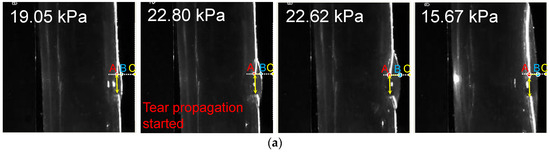 In order to observe the deformation of FL and TL during the pressurization, the temporal variation of tube pressure and deformation for the outer and inner layers are plotted in Figure 6b. The temporal deformations of the outer and inner layer are expressed using the variations of distance BC and AC indexed in Figure 6a, where A refers to the point of the edge of the internal tear, B is the intersection point of the transverse dashed line and the outer interface, and C is 3 px away from the largest-deformation point of B.