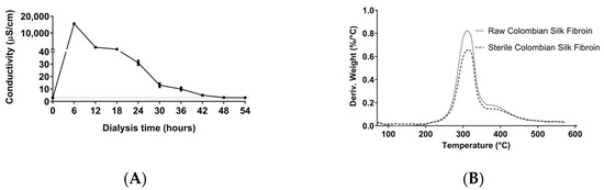 Figure 1. Purification and thermal stability of Colombian silk fibroin. (A) Monitoring of silk fibroin solution during dialysis. (B) Thermogravimetric analysis of raw and sterile silk fibroin.