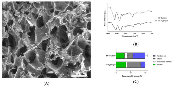 Figure 2. Physicochemical characterization of Colombian silk fibroin hydrogels. (A) SEM image of a Colombian silk fibroin hydrogel. The bar measures 200 μm. (B) FTIR spectra of Colombian silk fibroin in solution and hydrogel. (C) Secondary structure analysis of Colombian silk fibroin solution and hydrogel from deconvolution of FTIR spectra. The error bars indicate standard deviations of the measurements in triplicate. Data were analyzed using the ANOVA test.