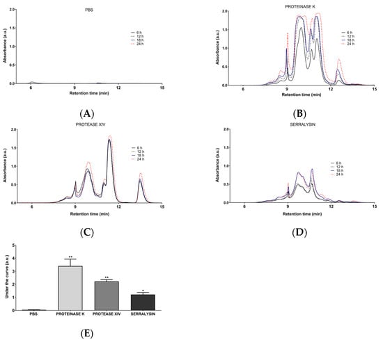 Figure 3. Chromatographic profiles of the supernatant after enzymatic degradation of Colombian silk fibroin hydrogels at 6, 12, 18, and 24 h, monitored at a wavelength of 214 nm: (A) Control (PBS); (B) Proteinase K; (C) Protease XV; (D) Serralysin. (E) Area under the curve for the enzymatic degradation profiles at 24 h. Error bars indicate standard deviations of triplicate measurements. Kruskal–Wallis test followed by a post hoc Dunn test. (*, p < 0.05); (**, p < 0.01).