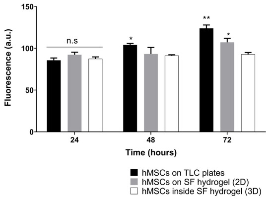Figure 4. Influence of Colombian silk fibroin hydrogels on hMSC metabolic activity after an incubation period of 24, 48 and 72 h, determined by the Alamar Blue assay. The error bars indicate the standard deviations of quadruplicate measurements. Data were analyzed using two-way ANOVA followed by a post hoc Tukey test. (n.s., nonsignificant); (*, p < 0.05); (**, p < 0.01).