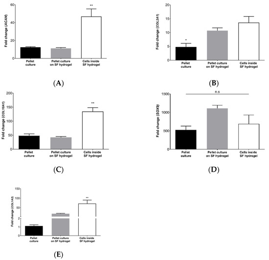 Figure 5. Chondrogenic gene expression profiles: (A) ACAN; (B) COL2A1; (C) COL10A1; (D) SOX9. (E) COL1A2. Error bars indicate standard deviations of triplicate measurements. Kruskal–Wallis test followed by a post hoc Dunn test. (n.s., nonsignificant); (*, p < 0.05); (**, p < 0.01).