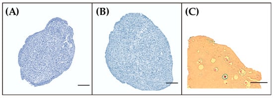 Figure 6. Alcian Blue stain of (A) pellet culture; (B) pellet culture on Colombian silk fibroin hydrogel; (C) cells inside Colombian silk fibroin hydrogel. The bars measure 50 μm.
