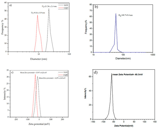 Dynamic light scattering of (a) CQD and TiO2, (b) CQD-TiO2; zeta potential of (c) CQD and TiO2, (d) CQD- TiO2.