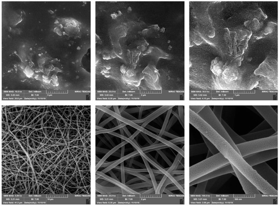 The SEM images of the CS-GO-CQD-TiO2, electrospun PVA, and CS-GO-CQD-TiO2 NC with a magnification of 10,000 times are displayed in Figure 2. In Figure 2 (top), a coherent structure with some roughness is seen. This compact structure indicates that the GO, CQD, CS, and TiO2 NPs were well connected. The roughness seen in Figure 2 (top) is due to the presence of large chitosan crystals. The addition of CS to NC has minimized the free volumes and increased the cohesion of the microstructure of the NC [46]. The results of increased condensation and roughness due to the presence of chitosan in the NC is consistent with the results of Yaowen Liu et al. [47]. In this regard, the SEM images of the research of Ahmed et al. showed that the GO NPs are well dispersed in the synthesized polymer, and filling the porosity of the polymer is effective in its final performance [48]. Another study suggested that, according to SEM images, the presence of CS-GO NPs in the polymer increased the roughness and height of the polymer [49]. Figure 2 (bottom) shows the electrospun CS-GO-CQD-TiO2 containing the PVA. The coherent surface and the obtained nanofibers illustrated the high compatibility of PVA with the NC and a compact structure lacking phase separation [50]. The absence of air bubbles, cracks, or pores further supports the excellent compatibility of the CS with PVA, as shown by Tripathi et al. [50].