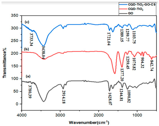 FTIR spectrum of GO (a), CQD-TiO2 (b), CQD-TiO2-GO-CS (c).