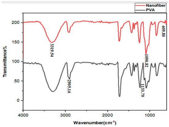 FTIR spectrum of PVA and CS-CQD-TiO2-GO electrospun nanofibrous mat. The red graph represents the CS-CQD-TiO2-GO nanofiber, and the black chart shows the PVA FTIR spectrum.