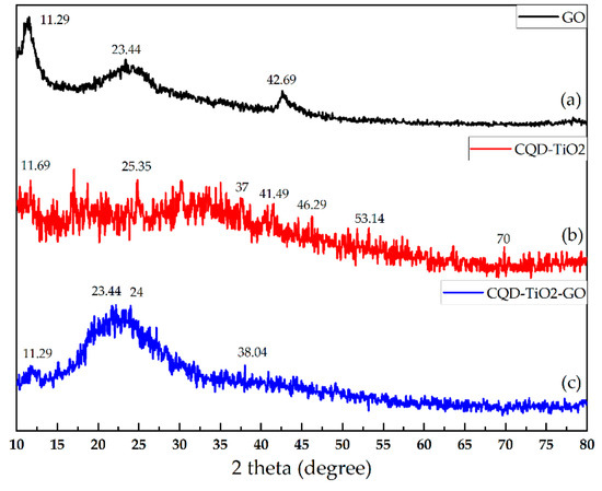 XRD pattern of GO (a), CQD-TiO2 (b), GO-CQD-TiO2 (c).