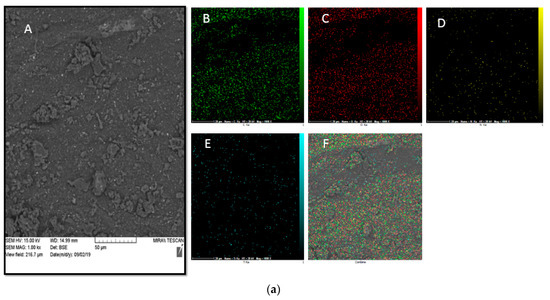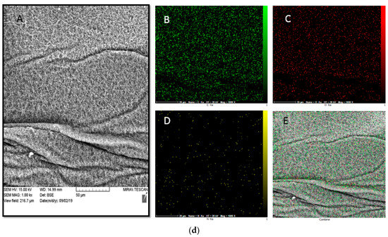 (a) Surface structure and elemental analysis of CS-GO-CQD-TiO2 NC: (A) SEM morphology of CS-GO-CQD-TiO2 NC; Images (B–E) represent carbon, oxygen, titanium, and nitrogen elements; Image (F) shows a combination of C, O, N and Ti elements. (b) EDS spectrum of CS-CQD-TiO2-GO NC. (c) EDS spectrum of CS-CQD-TiO2-GO electrospun nanofibrous mat. (d) Surface Structure and Elemental Analysis of PVA: (A) SEM morphology of PVA; Images (B–D) represent carbon, oxygen, and nitrogen elements; Image (E) shows a combination of C, O, and N elements.