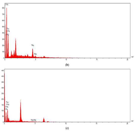 Figure 6a,b show SEM mapping and the EDS analysis of CS-CQD-TiO2-GO electrospun nanofibrous mats. SEM mapping for PVA was also carried out (Figure 6c) for the purpose of comparison. Figure 6a shows the uniform bead-free structure of the electrospun nanofibers. Similarly, Koosha et al. observed a uniform bead-free morphology for electrospun nanofibers of CS/PVA by SEM mapping and the EDS analysis [23]. The EDS spectrum of the electrospun nanofibers in Figure 6b confirmed the presence of C, O, N, and Ti elements related to CS, CQD, TiO2, and GO NPs. The presence of the Ti elements in comparison with Figure 6a,c indicates the significant distribution of the NPs in the PVA. Furthermore, the characteristic peaks of C, O, N, and Ti elements in Figure 6b were detected, showing that the NPs were uniformly distributed inside the nanofibers. The elemental compositions of the NC and nanofibers are reported in Table 2.