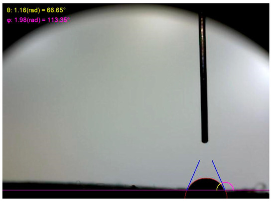 The secretions that are made during an ulcer to the surface of the wound create a favorable environment for the development of bacteria [61]. One of the critical variables in making a viable wound dressing is its capacity to assimilate water. The surface hydrophilicity of CS-CQD-TiO2-GO electrospun nanofibrous was evaluated using dynamic water contact angle (WCA) measurements. The WCA of CS-CQD-TiO2-GO electrospun nanofibrous mats is depicted in Figure 7. The nanofibrous mat’s WCA value was 66.65°. As mentioned in the articles, WCA over 90° means that the polymer surface is hydrophobic [62]. Therefore, it can be concluded that CS-CQD-TiO2-GO nanofibrous mats are hydrophilic. Notably, two essential factors affect the WCA value, namely the physical hydrophobicity of the material itself and the membrane surface roughness [63]. For example, in a previous paper, it has been shown that a hydrophobic polymer-based composite can be made by bonding hydrophobic substances to the surface of GO [64].