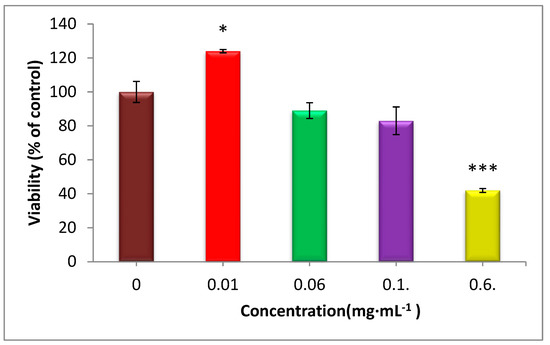 The cytotoxic effects of CQD-TiO2-GO-Cs NC on survival and proliferation of NIH3T3 fibroblast cells. The lowest toxicity was observed at the concentration of 0.01 μg·mL−1 (significant difference in comparison to control group: * p < 0.05 *), and the highest toxicity was at the concentration of 0.6 μg·mL−1 of the NC (significant difference in comparison to control group: *** p < 0.001).